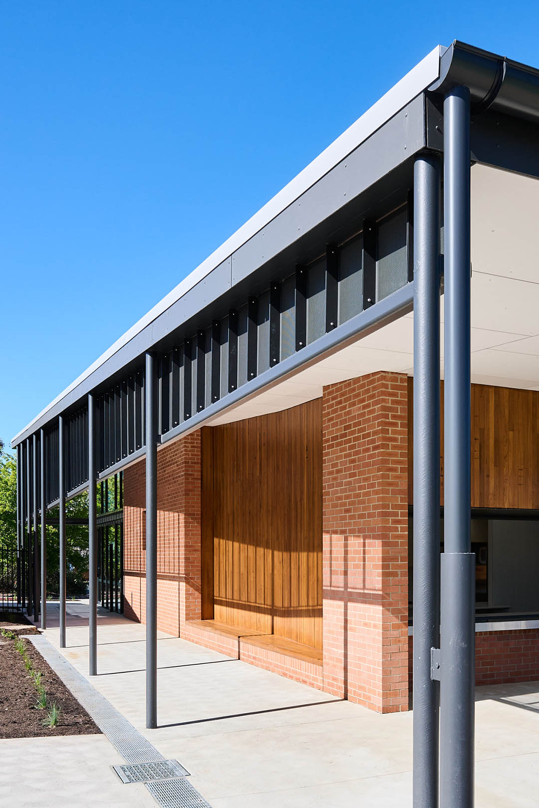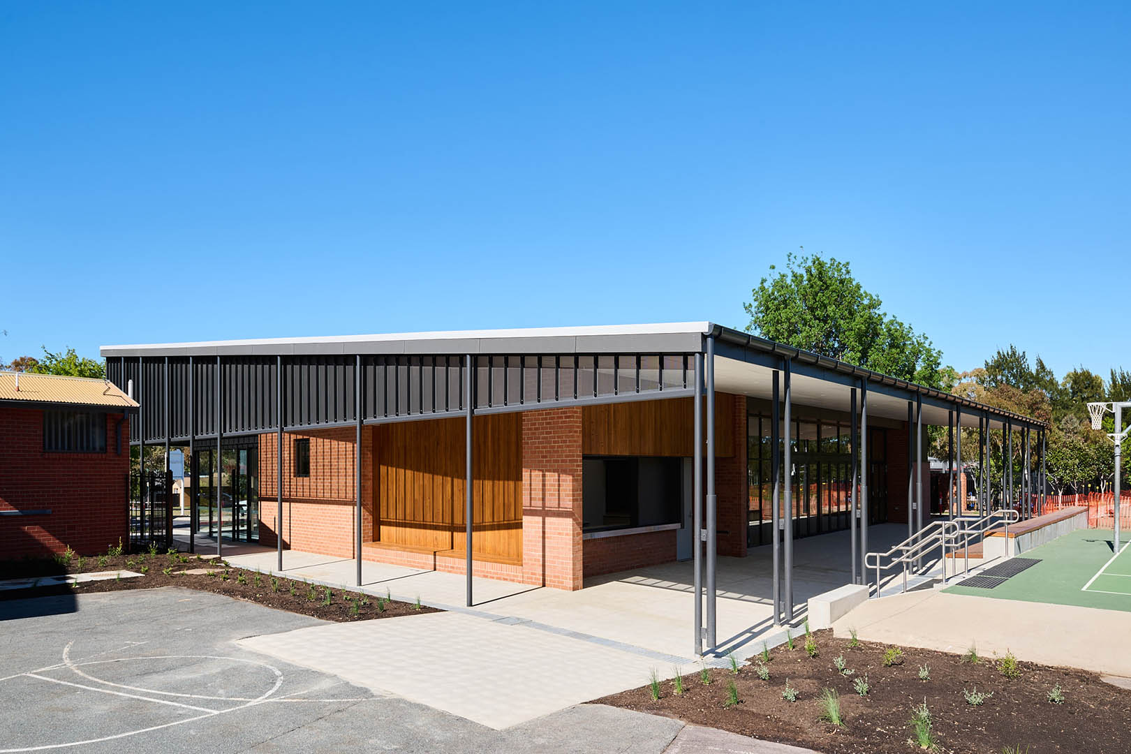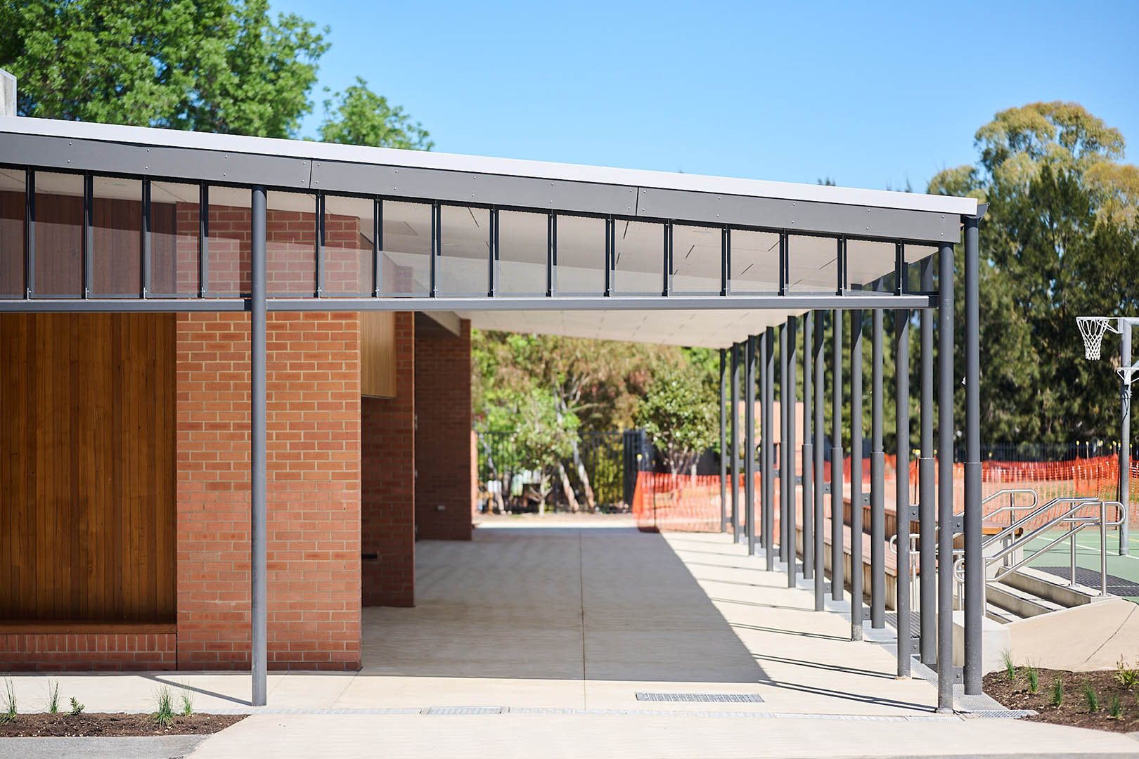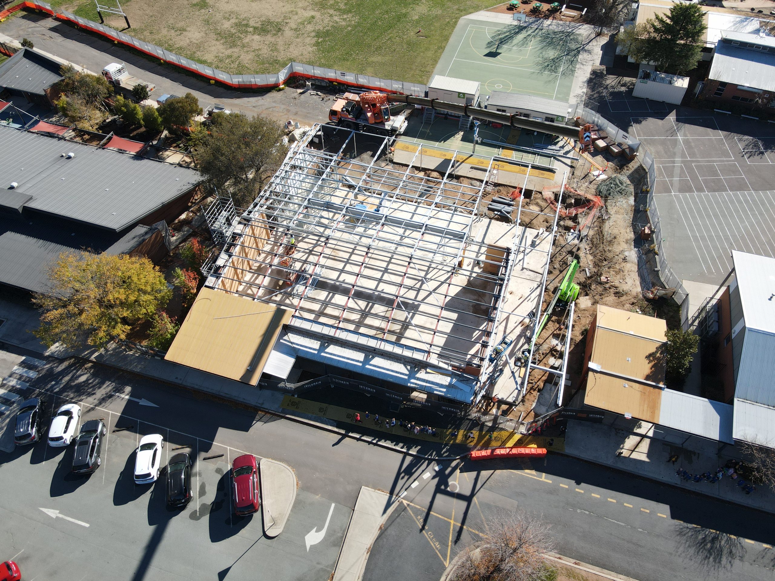 To meet the client’s objectives around time, budget, quality, and safety, Intermain implemented a staged methodology that minimised disruption to school operations. Works were programmed around school holidays and weekends, with deliveries and crane access coordinated to avoid peak drop-off and pick-up times. A temporary access road was installed via the rear oval, and pedestrian safety was maintained through fencing and barricades